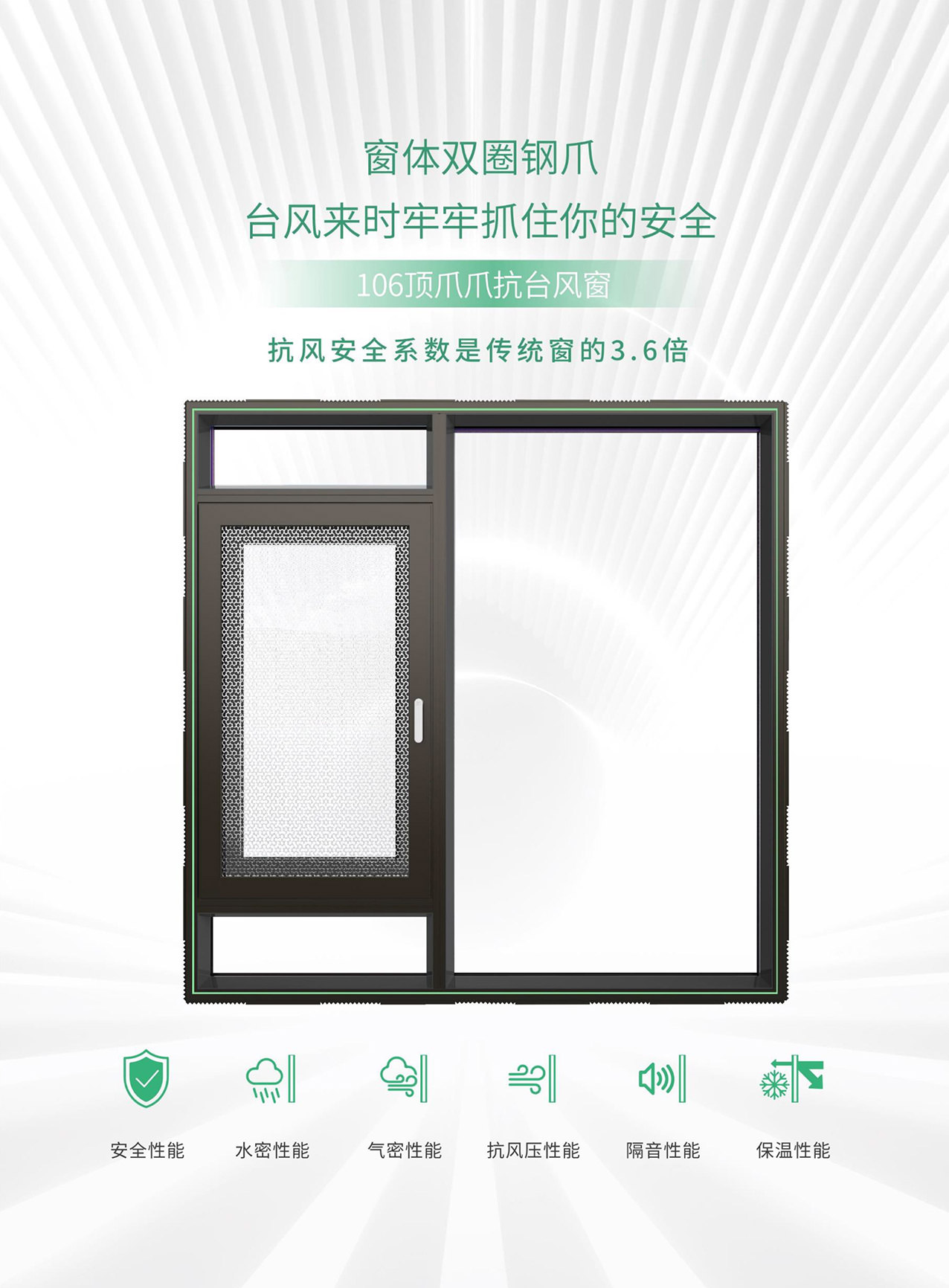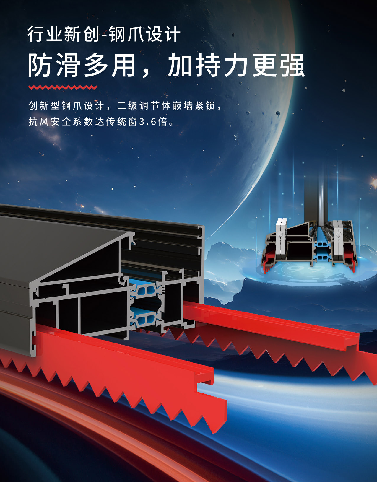 本产品以“安全为核心”的研发理念,搭载创新型花爪结构——采用航空级铝合金一体锻造,二级调节体嵌墙紧锁,抗风安全系数达传统窗3.6倍,经测试在17级强风持续冲击下仍能保持结构稳定,并兼顾防水、防尘功能,以“安全+实用”的双重优势,为居家安全筑牢防护屏障。