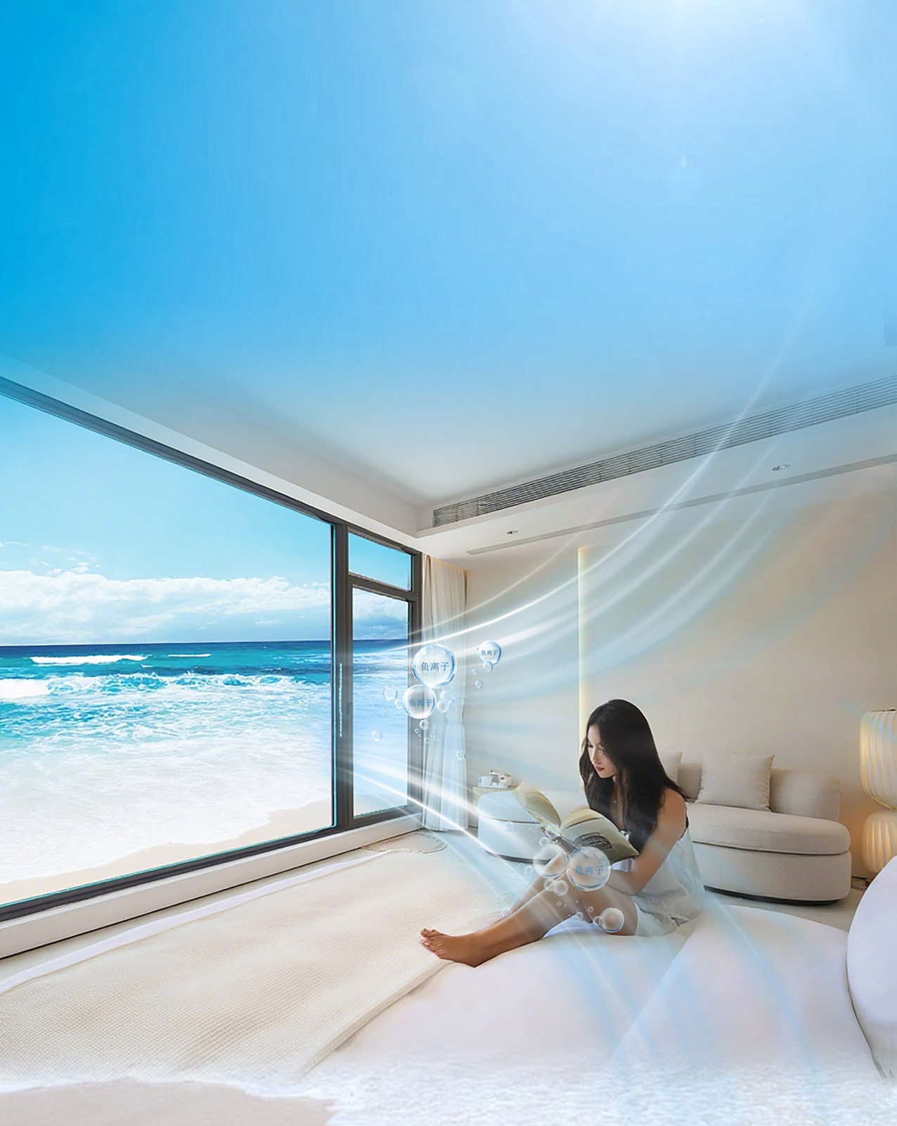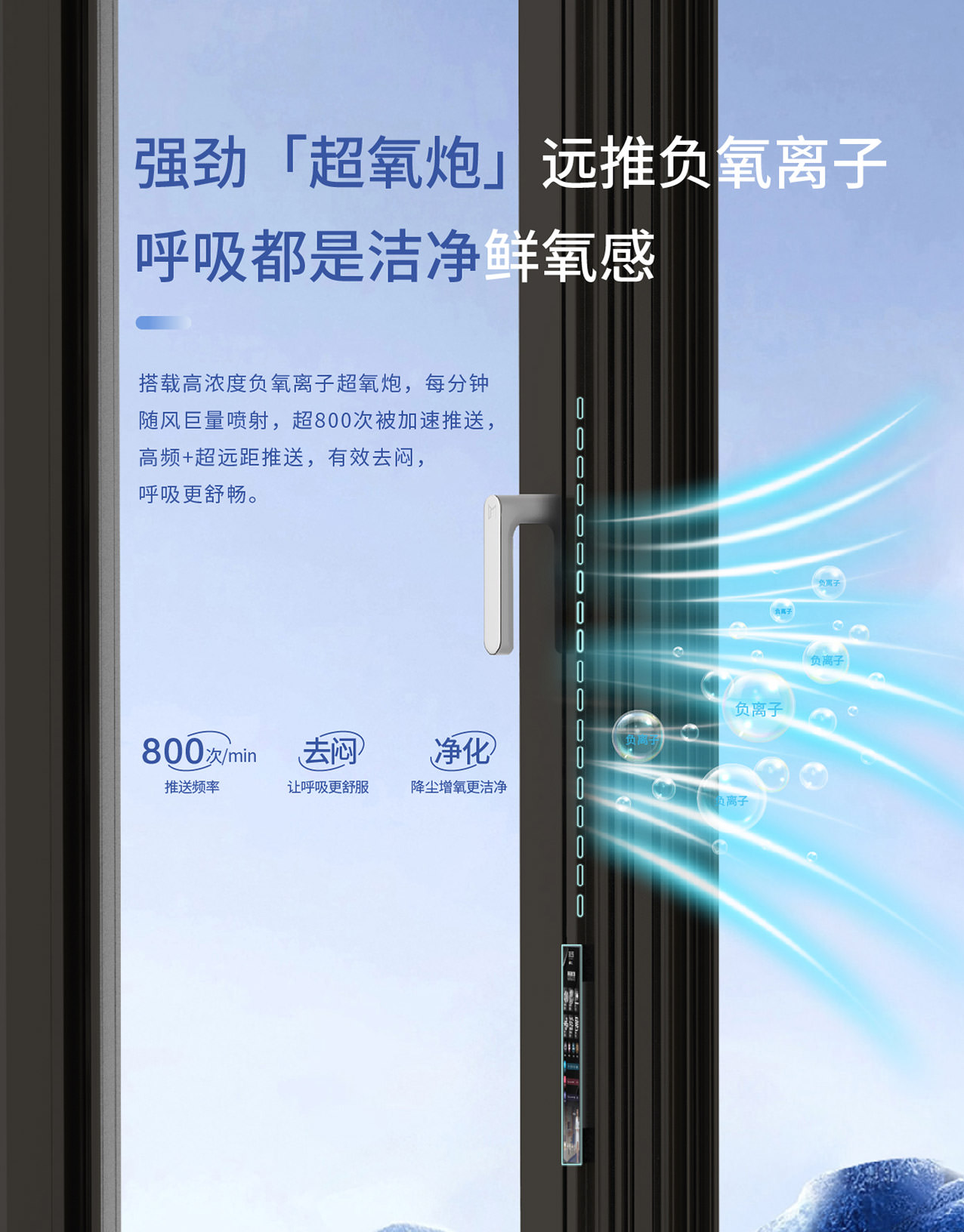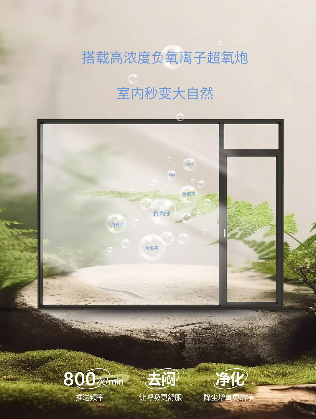 本产品突破性融合仿生巴马百魔洞负离子生成技术,门窗关闭后,窗体自带释放负离子设计,可释放高浓度负氧离子>20,000个/cm³,同步实现智能空气净化与恒温微气候,赋能健康人居。
