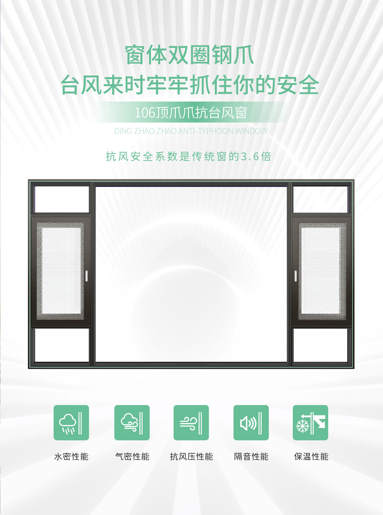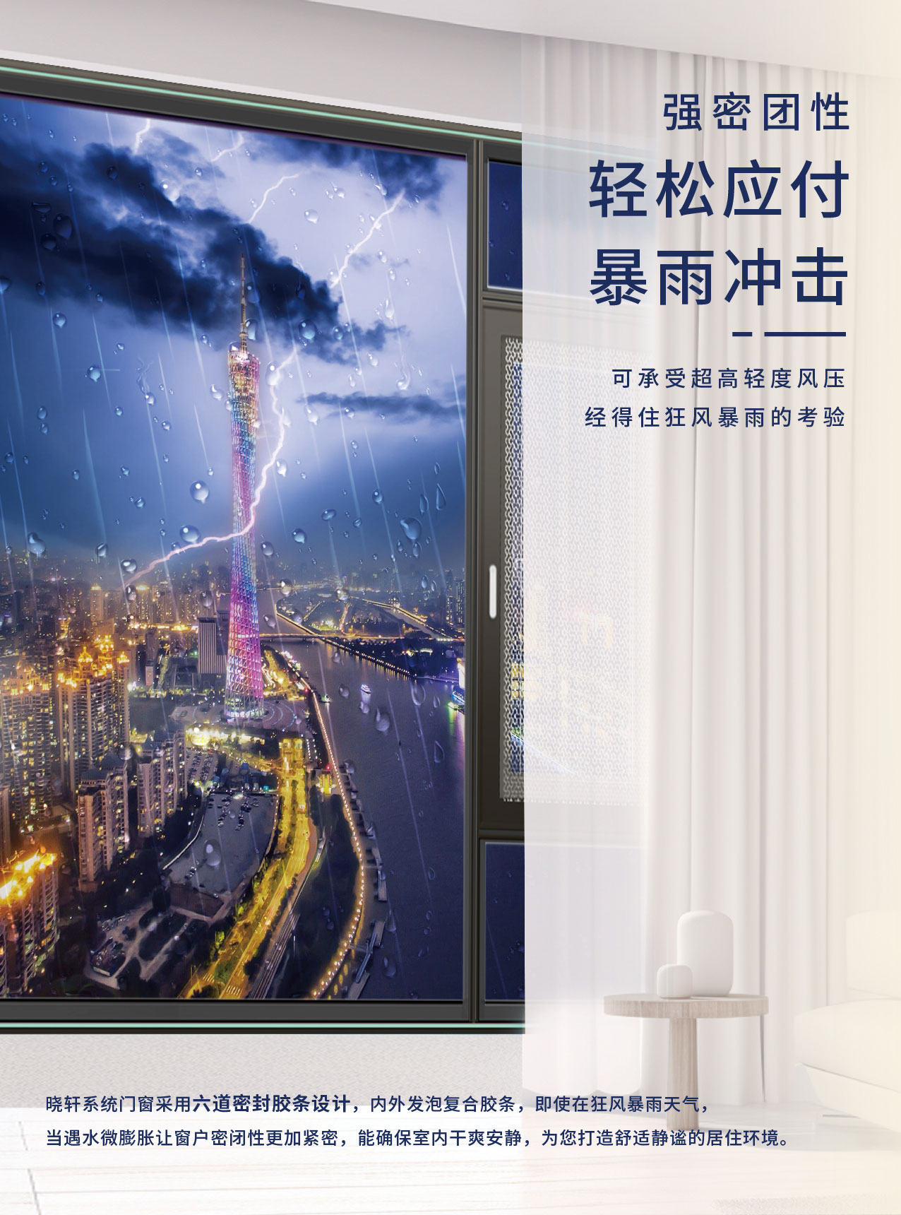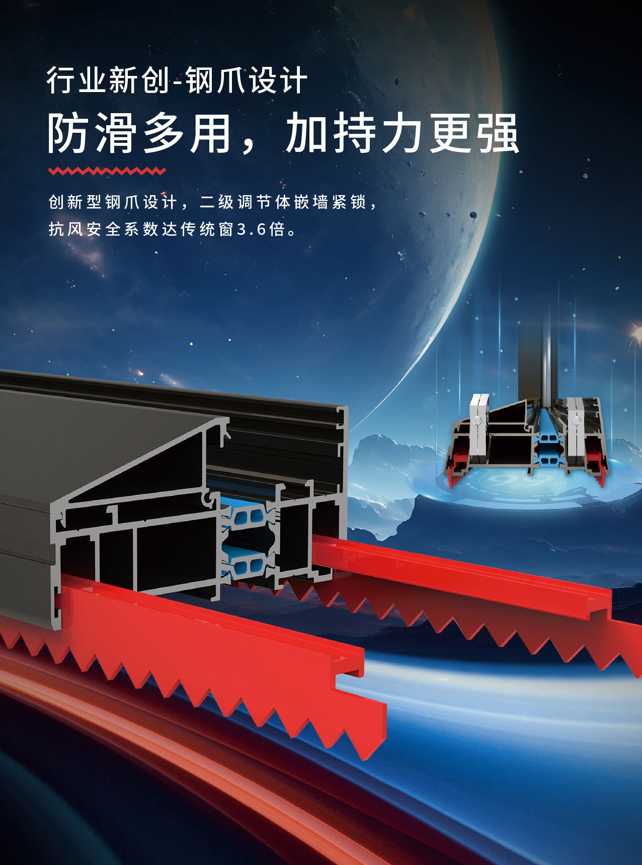 创新型钢爪设计,二级调节体嵌墙紧锁,抗风安全系数达传统窗3.6倍,拥有超高标准的水密性能、气密性能、抗风压性能、隔音性能、保温性能。