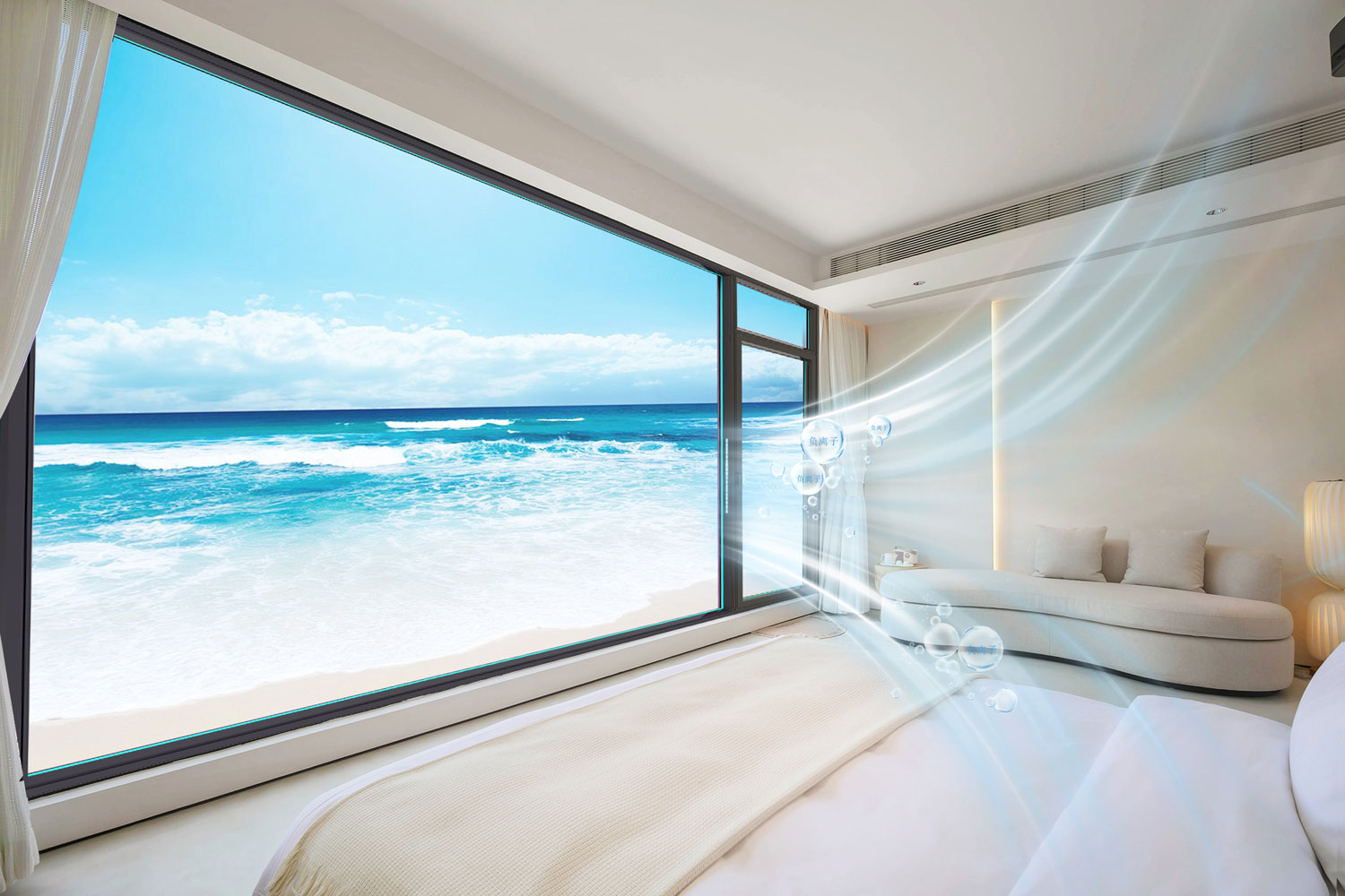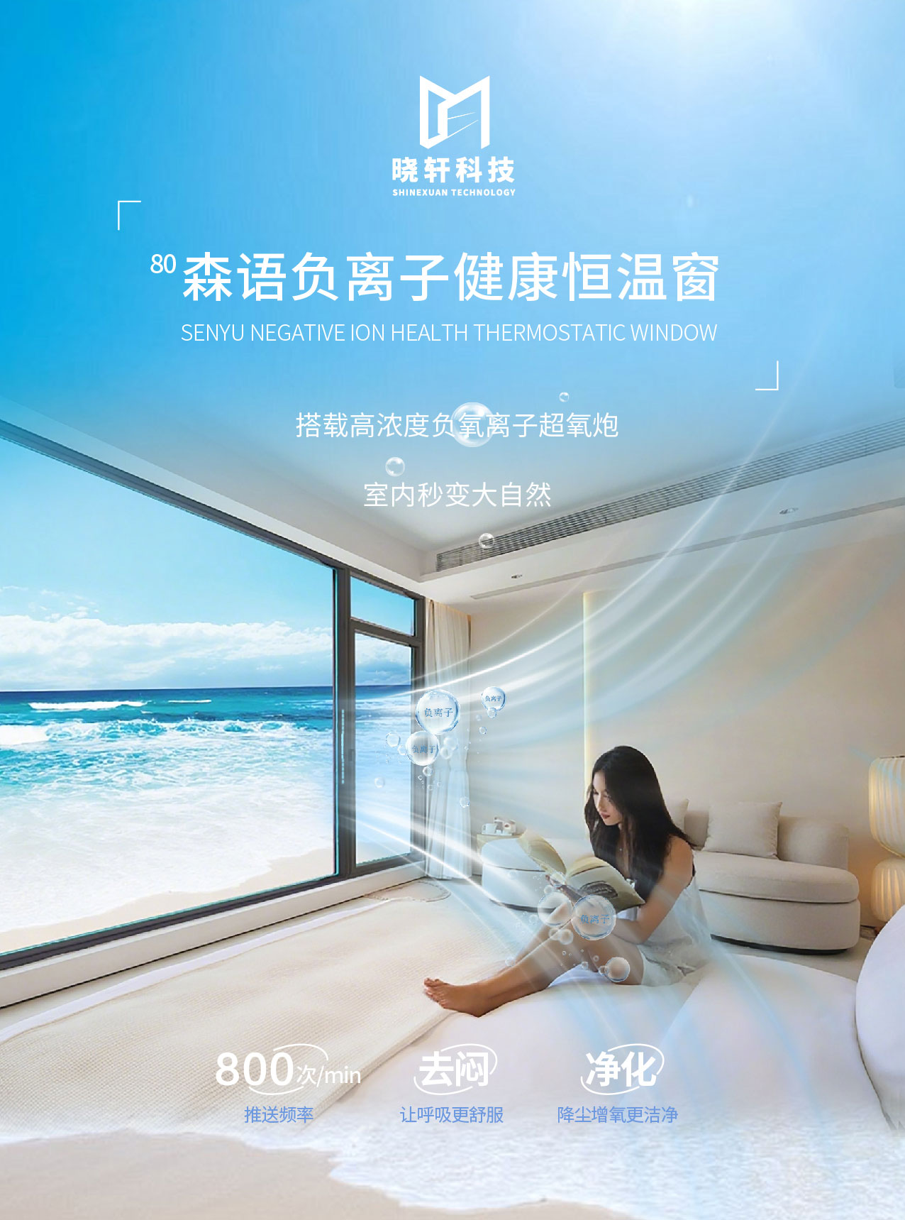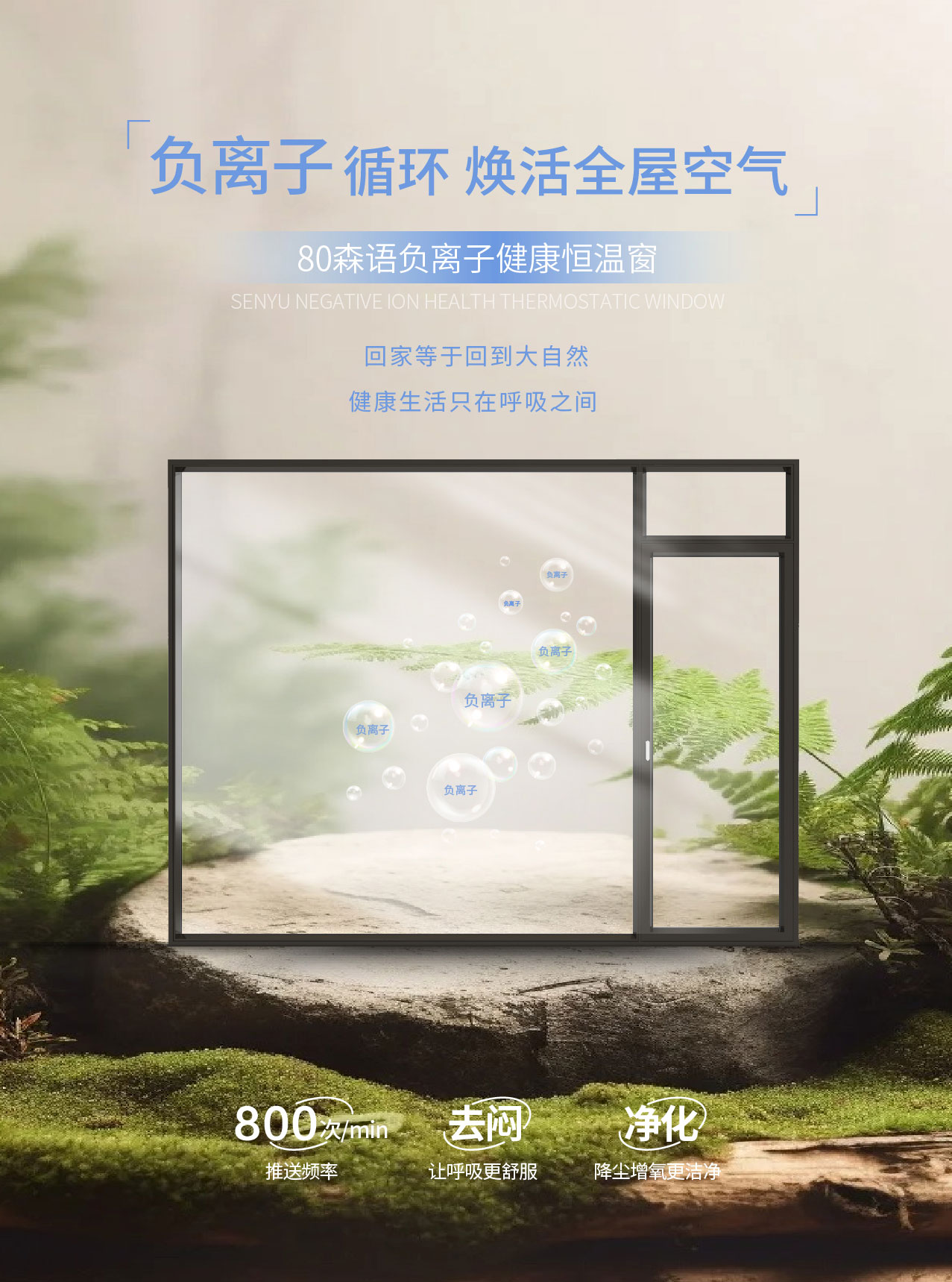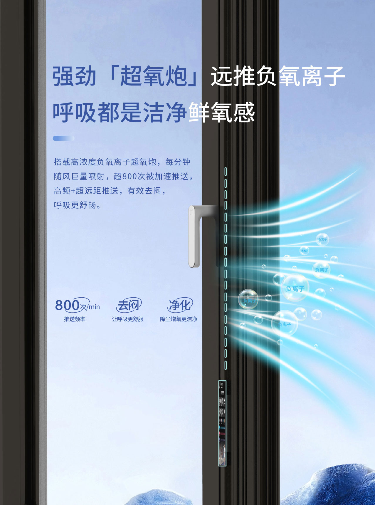 窗体自带释放负离子设计,可释放高浓度负氧离子≥20,000 个/cm³,仿生巴马百魔洞,恒静温控,智能净化,赋能健康人居。