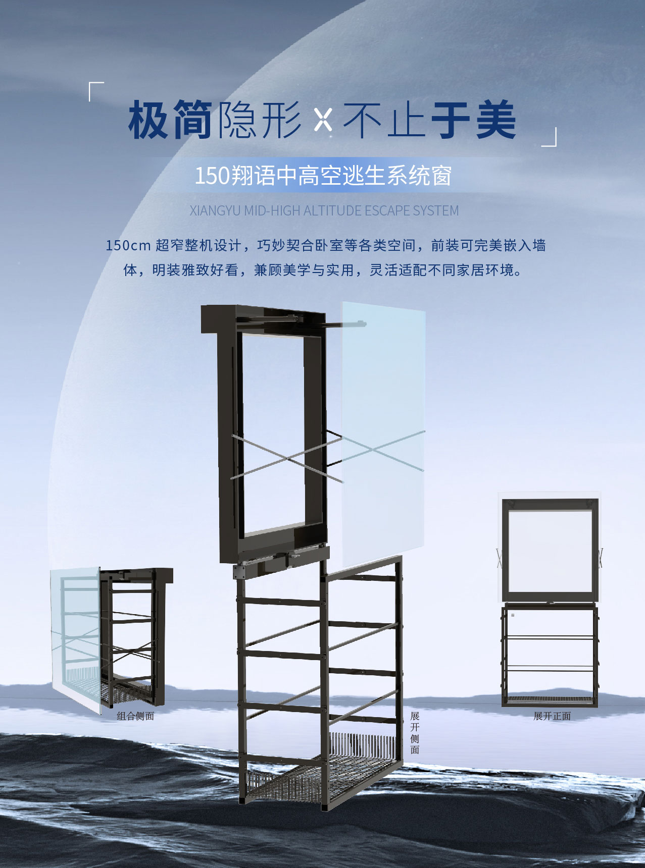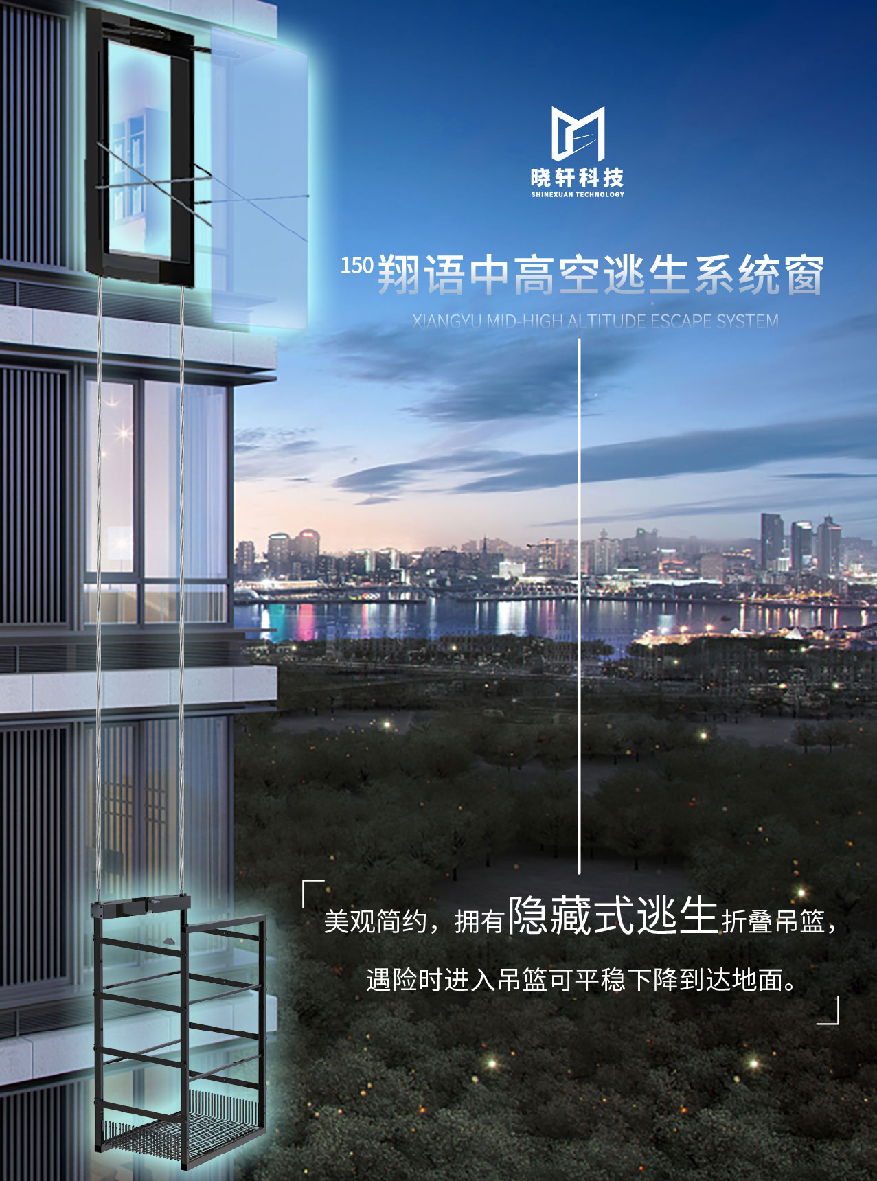 美观简约,拥有隐藏式逃生折叠吊篮,遇险时进入吊篮可平稳下降到达地面。